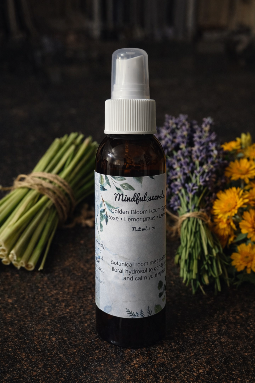 A soft, uplifting floral room spray made with lemongrass, lavender, and calendula hydrosols, layered with rose, lavender, and lemongrass fragrance. Designed to create a peaceful, inviting atmosphere in any space.